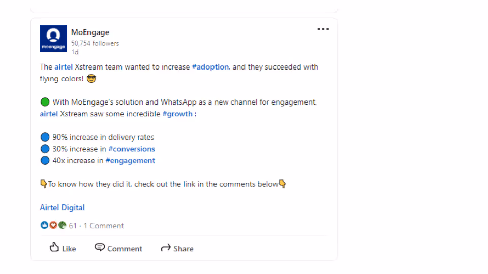 Videos: Journey to success videos, product demonstrations, webinars, and sponsored videos of topline businesses' growth stories that spotlight one of CleverTap’s core benefits - “customer retention”. Eg: chat shows on customer retention - reshaping India’s internet usage with Jio.