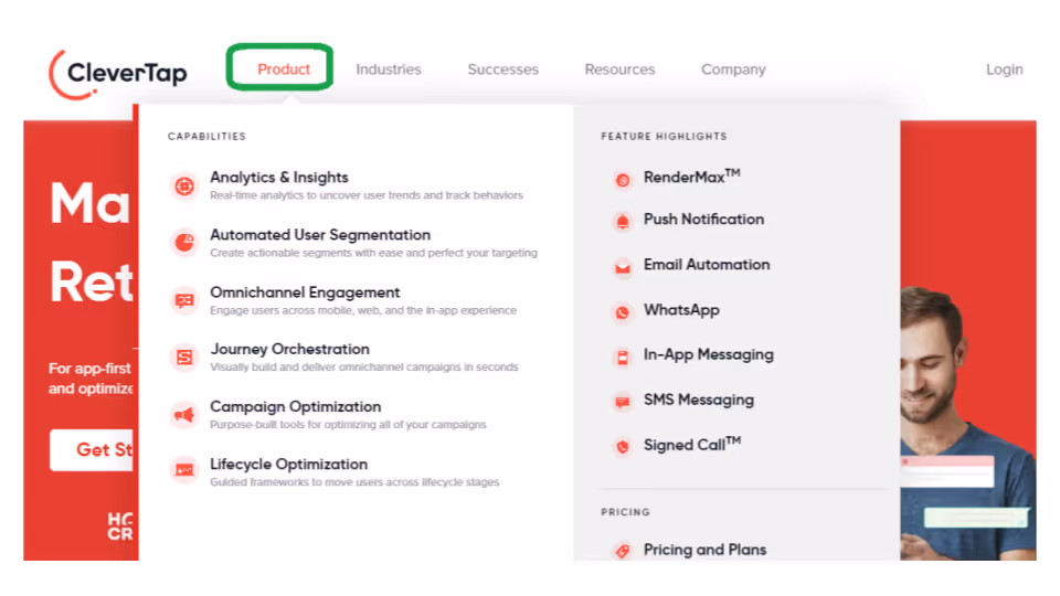 In this section, CleverTap has categorized its capabilities into 6 different sub-services. On the other hand, it also highlights several significant features of the platform.