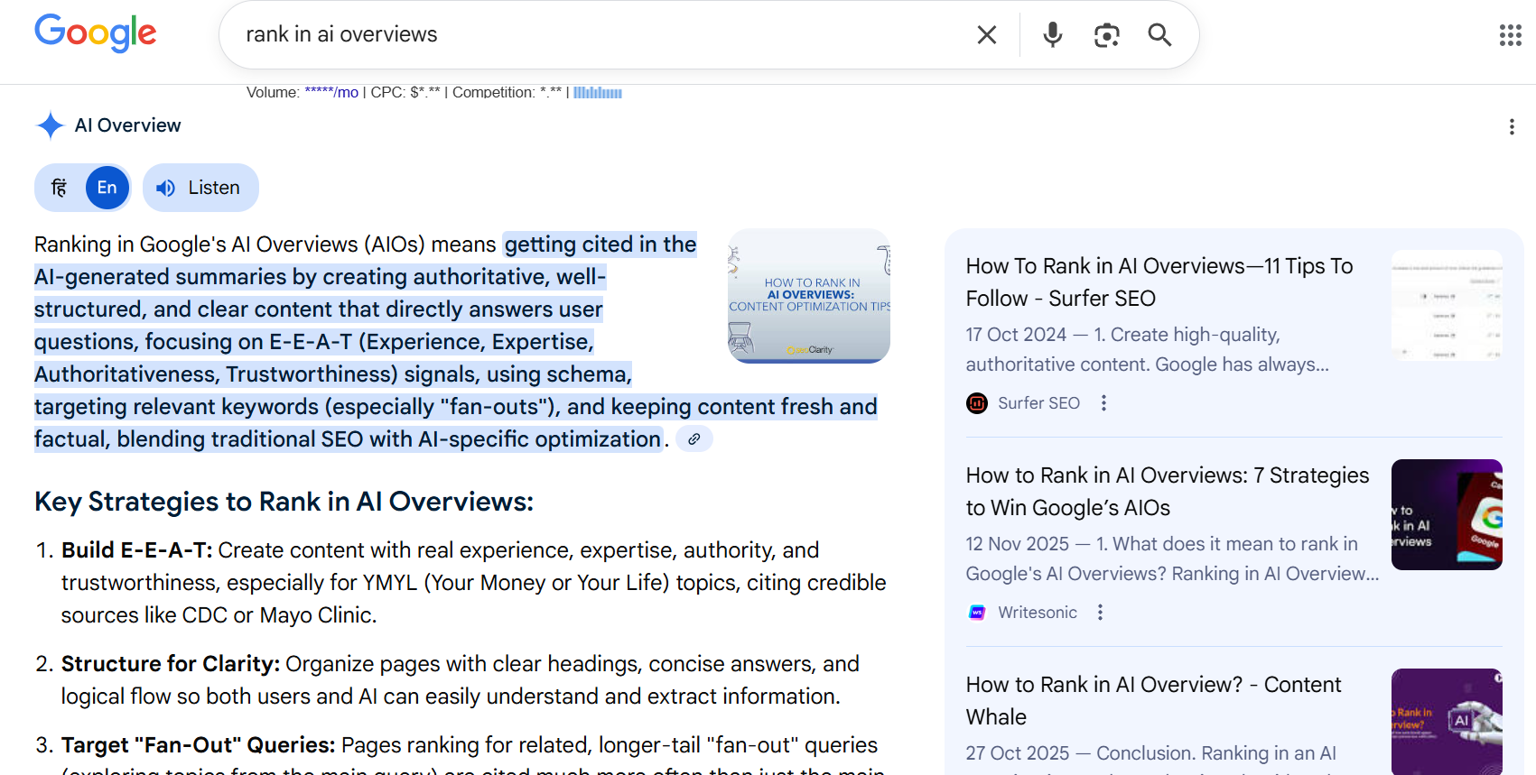 While high-volume keywords are important, don’t overlook low-volume, question-based queries. These long-tail keywords often trigger AI overviews and have less competition. Target informational queries that match common user questions, even if they don’t have massive search volume.