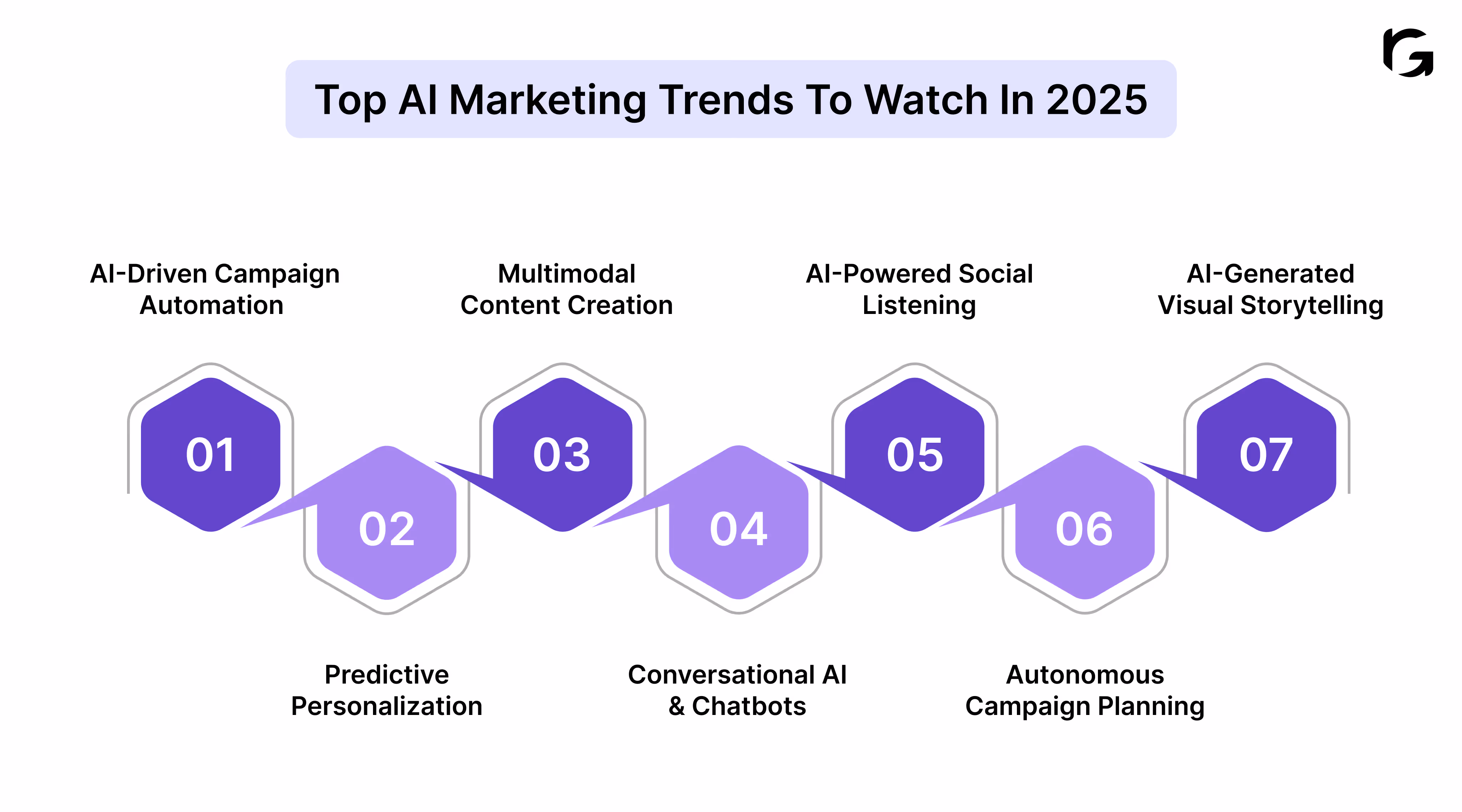 Now that we’ve seen how fast AI adoption is growing, let’s dive into the AI marketing trends that are defining 2025. These trends aren’t just predictions; leading brands are already using them to innovate how they create content, connect with audiences, and scale faster than ever.