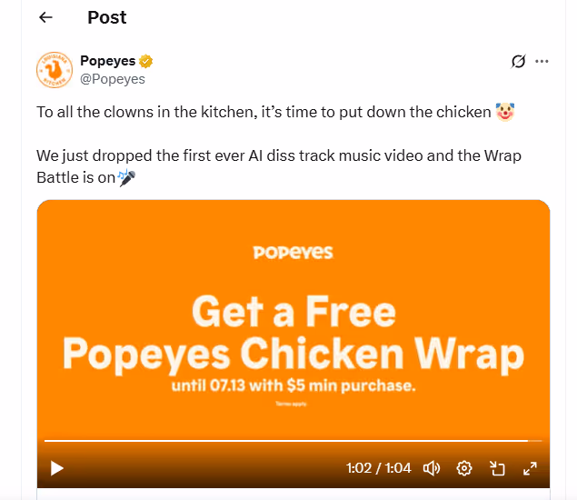 Take the example of Popeyes, which used AI tools Suno and Veo to launch a fun, fast-turnaround diss-track campaign for a new menu item. It had vocals, visuals, and style, all built in just three days. It was a perfect fit for Gen Z’s love of fun, fast, meme-worthy content.