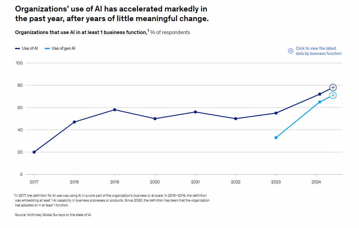 Adoption surged from 33% in 2023 to 71% in 2024, with marketing among the top three functions using GenAI tools.
