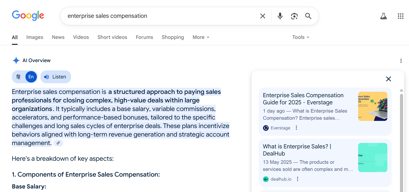 For example, we’ve built a content engine for Everstage, a sales compensation and management platform. The content engine includes an AI-assisted workflow grounded in intent research, SERP and AI Overview analysis, structured drafting, Clearscope optimization, technical SEO layering, and human editorial polish. This engine has helped us produce 100+ long-form assets in just a few months, most of which now rank on Page 1 SERP and surface in AI Overview, ChatGPT, and Perplexity results.