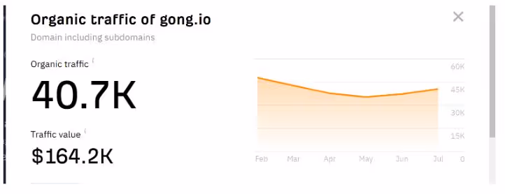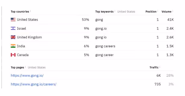 - While Gong uses paid and branded keywords like "Gong", "Gong.io", and "Conversational Intelligence Tools", most of its traffic comes in organically which just proves how hard they have worked on creating a spot for themselves on the web.