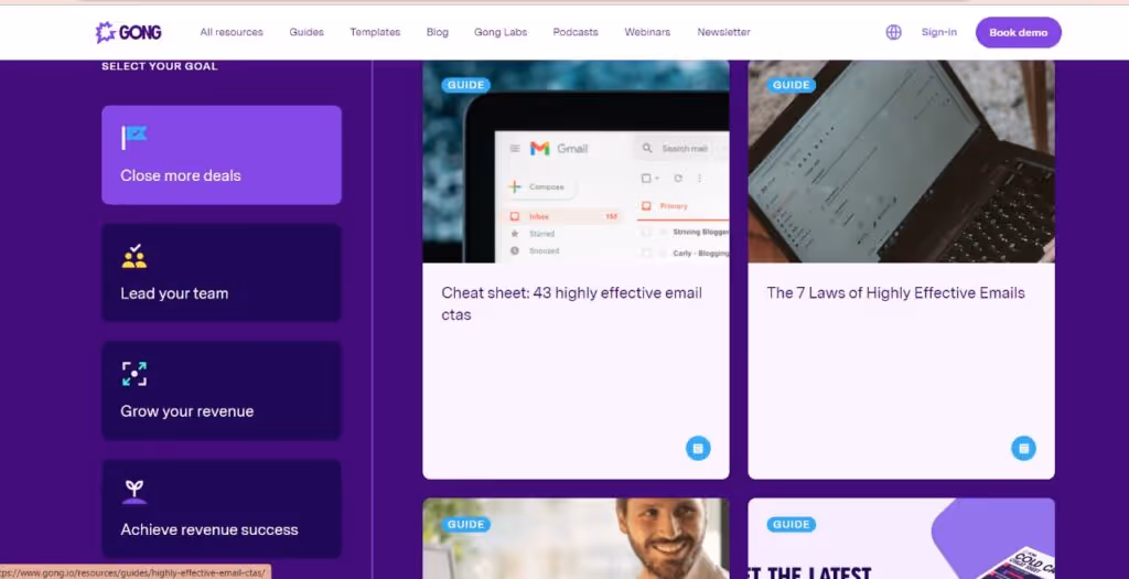 - Gong does this by categorizing resources for specific goals like closing deals, leading teams, and growing revenue. It makes it easier for people to find relevant content.