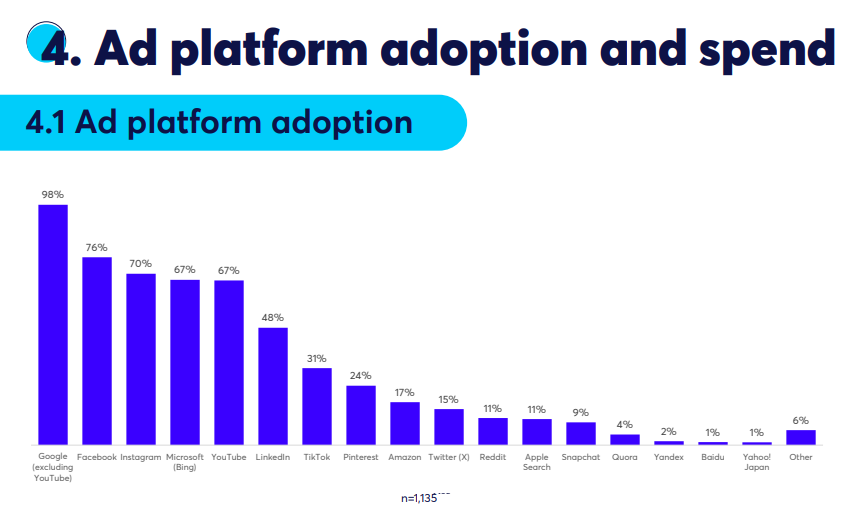 In fact, a global State of PPC report found that 98% of advertisers use Google Ads, while other social media platforms remain key components in the paid mix. The same report shows that while Google leads, 67–76% of marketers also run campaigns on platforms like Facebook, Instagram, and Microsoft (Bing), indicating that successful PPC strategies often require multi‑platform reach.