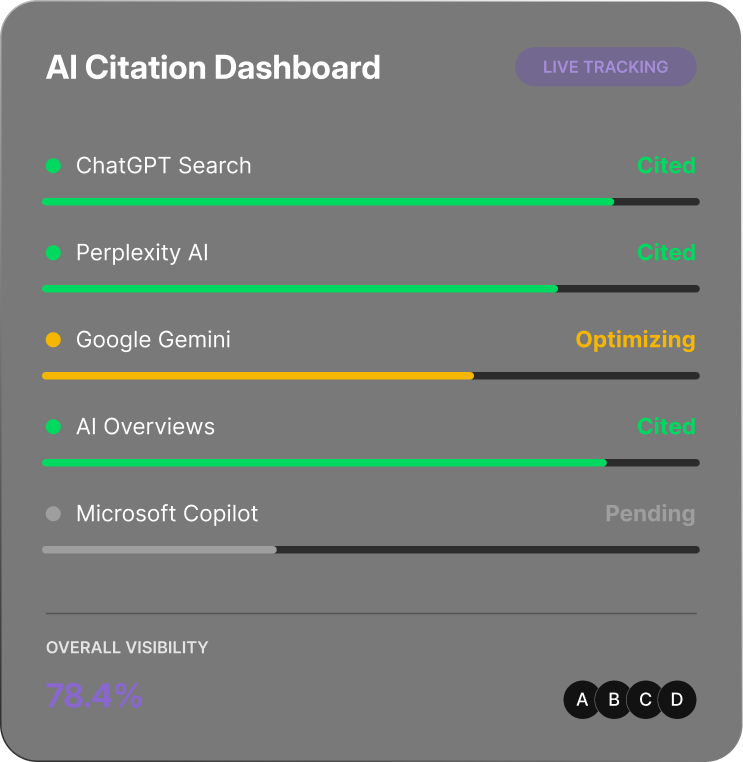 AEO is not set-and-forget. AI models update frequently. We run continuous citation tracking across ChatGPT, Perplexity, Gemini, and AI Overviews, with competitor benchmarking and monthly strategy adjustments built in.