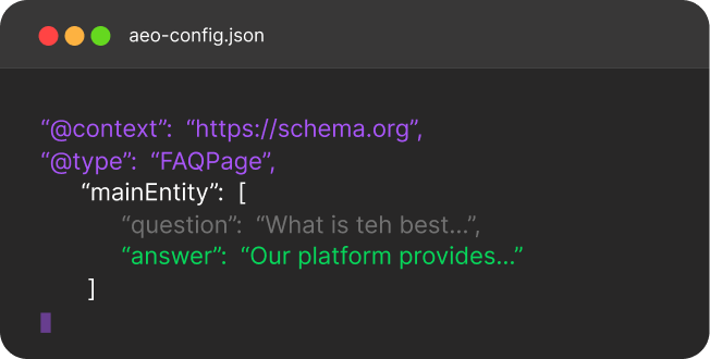 AEO optimizes your content, structured data, and authority so AI platforms like ChatGPT, Perplexity, and Gemini cite your brand when buyers ask relevant questions. It's the next layer of search beyond Google rankings.
